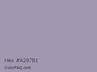 Hex #a297b1 Color is a light violet color and the nearest color is Amethyst Smoke #a397b4. Hex code #a297b1 and RGB value is rgb(162,151,177). In RGB color space, this color is composed of 64% red, 59% green, 69% blue, In CMYK color space, this color is composed of 8% cyan, 15% magenta, 0% yellow , 31% black , In HSL color space, this color has a hue angle of 265° , 14% saturation and 64% lightness.