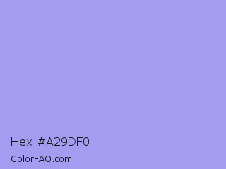 Hex #a29df0 Color is a light indigo color and the nearest color is Dull Lavender #a899e6. Hex code #a29df0 and RGB value is rgb(162,157,240). In RGB color space, this color is composed of 64% red, 62% green, 94% blue, In CMYK color space, this color is composed of 33% cyan, 35% magenta, 0% yellow , 6% black , In HSL color space, this color has a hue angle of 244° , 73% saturation and 78% lightness.