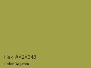 Hex #a2a348 Color is a normal yellow color and the nearest color is Brass #b5a642. Hex code #a2a348 and RGB value is rgb(162,163,72). In RGB color space, this color is composed of 64% red, 64% green, 28% blue, In CMYK color space, this color is composed of 1% cyan, 0% magenta, 56% yellow , 36% black , In HSL color space, this color has a hue angle of 61° , 39% saturation and 46% lightness.