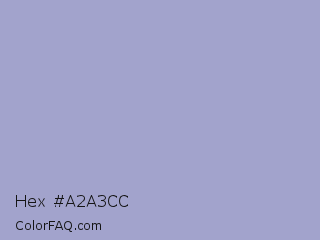 Hex #a2a3cc Color is a light blue color and the nearest color is Blue Bell #a2a2d0. Hex code #a2a3cc and RGB value is rgb(162,163,204). In RGB color space, this color is composed of 64% red, 64% green, 80% blue, In CMYK color space, this color is composed of 21% cyan, 20% magenta, 0% yellow , 20% black , In HSL color space, this color has a hue angle of 239° , 29% saturation and 72% lightness.