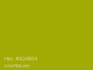 Hex #a2ab04 Color is a normal yellow color and the nearest color is Apple Green #8db600. Hex code #a2ab04 and RGB value is rgb(162,171,4). In RGB color space, this color is composed of 64% red, 67% green, 2% blue, In CMYK color space, this color is composed of 5% cyan, 0% magenta, 98% yellow , 33% black , In HSL color space, this color has a hue angle of 63° , 95% saturation and 34% lightness.