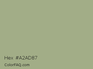 Hex #a2ad87 Color is a normal lime color and the nearest color is Sage #9ea587. Hex code #a2ad87 and RGB value is rgb(162,173,135). In RGB color space, this color is composed of 64% red, 68% green, 53% blue, In CMYK color space, this color is composed of 6% cyan, 0% magenta, 22% yellow , 32% black , In HSL color space, this color has a hue angle of 77° , 19% saturation and 60% lightness.