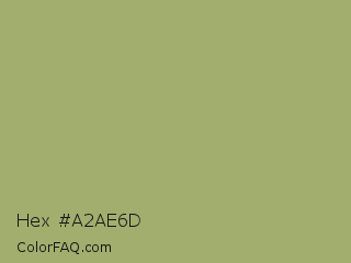 Hex #a2ae6d Color is a normal lime color and the nearest color is Green Smoke #a4af6e. Hex code #a2ae6d and RGB value is rgb(162,174,109). In RGB color space, this color is composed of 64% red, 68% green, 43% blue, In CMYK color space, this color is composed of 7% cyan, 0% magenta, 37% yellow , 32% black , In HSL color space, this color has a hue angle of 71° , 29% saturation and 55% lightness.
