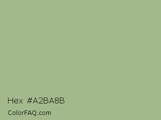 Hex #a2ba8b Color is a light green color and the nearest color is Swamp Green #acb78e. Hex code #a2ba8b and RGB value is rgb(162,186,139). In RGB color space, this color is composed of 64% red, 73% green, 55% blue, In CMYK color space, this color is composed of 13% cyan, 0% magenta, 25% yellow , 27% black , In HSL color space, this color has a hue angle of 91° , 25% saturation and 64% lightness.
