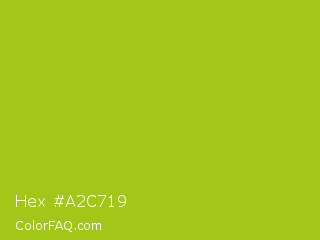 Hex #a2c719 Color is a normal lime color and the nearest color is Bahia #a5cb0c. Hex code #a2c719 and RGB value is rgb(162,199,25). In RGB color space, this color is composed of 64% red, 78% green, 10% blue, In CMYK color space, this color is composed of 19% cyan, 0% magenta, 87% yellow , 22% black , In HSL color space, this color has a hue angle of 73° , 78% saturation and 44% lightness.