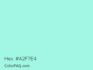 Hex #a2f7e4 Color is a light cyan color and the nearest color is Water Leaf #a1e9de. Hex code #a2f7e4 and RGB value is rgb(162,247,228). In RGB color space, this color is composed of 64% red, 97% green, 89% blue, In CMYK color space, this color is composed of 34% cyan, 0% magenta, 8% yellow , 3% black , In HSL color space, this color has a hue angle of 167° , 84% saturation and 80% lightness.