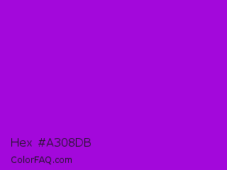 Hex #a308db Color is a normal purple color and the nearest color is Dark Violet #9400d3. Hex code #a308db and RGB value is rgb(163,8,219). In RGB color space, this color is composed of 64% red, 3% green, 86% blue, In CMYK color space, this color is composed of 26% cyan, 96% magenta, 0% yellow , 14% black , In HSL color space, this color has a hue angle of 284° , 93% saturation and 45% lightness.