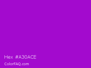 Hex #a30ace Color is a normal purple color and the nearest color is Purple Munsell #9f00c5. Hex code #a30ace and RGB value is rgb(163,10,206). In RGB color space, this color is composed of 64% red, 4% green, 81% blue, In CMYK color space, this color is composed of 21% cyan, 95% magenta, 0% yellow , 19% black , In HSL color space, this color has a hue angle of 287° , 91% saturation and 42% lightness.