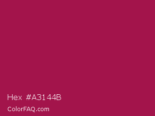 Hex #a3144b Color is a normal rose color and the nearest color is French Wine #ac1e44. Hex code #a3144b and RGB value is rgb(163,20,75). In RGB color space, this color is composed of 64% red, 8% green, 29% blue, In CMYK color space, this color is composed of 0% cyan, 88% magenta, 54% yellow , 36% black , In HSL color space, this color has a hue angle of 337° , 78% saturation and 36% lightness.