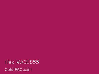 Hex #a31855 Color is a normal rose color and the nearest color is Jazzberry Jam #a50b5e. Hex code #a31855 and RGB value is rgb(163,24,85). In RGB color space, this color is composed of 64% red, 9% green, 33% blue, In CMYK color space, this color is composed of 0% cyan, 85% magenta, 48% yellow , 36% black , In HSL color space, this color has a hue angle of 334° , 74% saturation and 37% lightness.