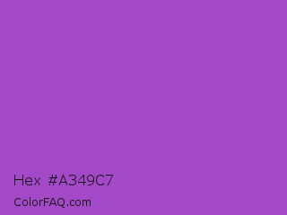 Hex #a349c7 Color is a normal purple color and the nearest color is Deep Lilac #9955bb. Hex code #a349c7 and RGB value is rgb(163,73,199). In RGB color space, this color is composed of 64% red, 29% green, 78% blue, In CMYK color space, this color is composed of 18% cyan, 63% magenta, 0% yellow , 22% black , In HSL color space, this color has a hue angle of 283° , 53% saturation and 53% lightness.