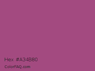 Hex #a34b80 Color is a normal magenta color and the nearest color is Magenta Haze #9f4576. Hex code #a34b80 and RGB value is rgb(163,75,128). In RGB color space, this color is composed of 64% red, 29% green, 50% blue, In CMYK color space, this color is composed of 0% cyan, 54% magenta, 21% yellow , 36% black , In HSL color space, this color has a hue angle of 324° , 37% saturation and 47% lightness.