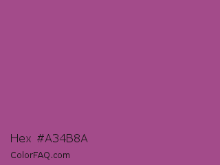 Hex #a34b8a Color is a normal magenta color and the nearest color is Magenta Haze #9f4576. Hex code #a34b8a and RGB value is rgb(163,75,138). In RGB color space, this color is composed of 64% red, 29% green, 54% blue, In CMYK color space, this color is composed of 0% cyan, 54% magenta, 15% yellow , 36% black , In HSL color space, this color has a hue angle of 317° , 37% saturation and 47% lightness.