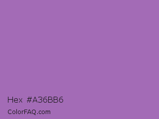 Hex #a36bb6 Color is a normal purple color and the nearest color is Wisteria #9771b5. Hex code #a36bb6 and RGB value is rgb(163,107,182). In RGB color space, this color is composed of 64% red, 42% green, 71% blue, In CMYK color space, this color is composed of 10% cyan, 41% magenta, 0% yellow , 29% black , In HSL color space, this color has a hue angle of 285° , 34% saturation and 57% lightness.