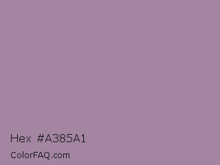 Hex #a385a1 Color is a normal magenta color and the nearest color is Bouquet #ae809e. Hex code #a385a1 and RGB value is rgb(163,133,161). In RGB color space, this color is composed of 64% red, 52% green, 63% blue, In CMYK color space, this color is composed of 0% cyan, 18% magenta, 1% yellow , 36% black , In HSL color space, this color has a hue angle of 304° , 14% saturation and 58% lightness.