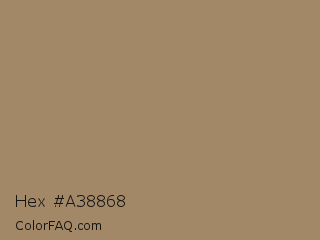 Hex #a38868 Color is a normal orange color and the nearest color is Sandal #aa8d6f. Hex code #a38868 and RGB value is rgb(163,136,104). In RGB color space, this color is composed of 64% red, 53% green, 41% blue, In CMYK color space, this color is composed of 0% cyan, 17% magenta, 36% yellow , 36% black , In HSL color space, this color has a hue angle of 33° , 24% saturation and 52% lightness.