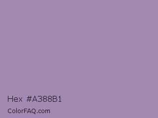 Hex #a388b1 Color is a light purple color and the nearest color is Glossy Grape #ab92b3. Hex code #a388b1 and RGB value is rgb(163,136,177). In RGB color space, this color is composed of 64% red, 53% green, 69% blue, In CMYK color space, this color is composed of 8% cyan, 23% magenta, 0% yellow , 31% black , In HSL color space, this color has a hue angle of 280° , 21% saturation and 61% lightness.