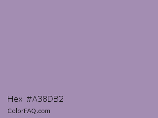 Hex #a38db2 Color is a light purple color and the nearest color is Glossy Grape #ab92b3. Hex code #a38db2 and RGB value is rgb(163,141,178). In RGB color space, this color is composed of 64% red, 55% green, 70% blue, In CMYK color space, this color is composed of 8% cyan, 21% magenta, 0% yellow , 30% black , In HSL color space, this color has a hue angle of 276° , 19% saturation and 63% lightness.