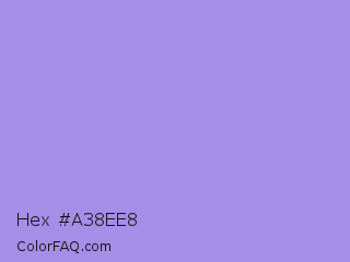 Hex #a38ee8 Color is a light indigo color and the nearest color is Dull Lavender #a899e6. Hex code #a38ee8 and RGB value is rgb(163,142,232). In RGB color space, this color is composed of 64% red, 56% green, 91% blue, In CMYK color space, this color is composed of 30% cyan, 39% magenta, 0% yellow , 9% black , In HSL color space, this color has a hue angle of 254° , 66% saturation and 73% lightness.