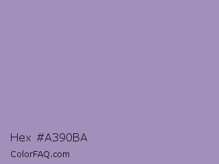 Hex #a390ba Color is a light violet color and the nearest color is Amethyst Smoke #a397b4. Hex code #a390ba and RGB value is rgb(163,144,186). In RGB color space, this color is composed of 64% red, 56% green, 73% blue, In CMYK color space, this color is composed of 12% cyan, 23% magenta, 0% yellow , 27% black , In HSL color space, this color has a hue angle of 267° , 23% saturation and 65% lightness.