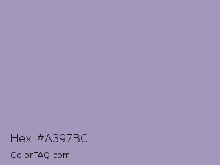 Hex #a397bc Color is a light indigo color and the nearest color is Amethyst Smoke #a397b4. Hex code #a397bc and RGB value is rgb(163,151,188). In RGB color space, this color is composed of 64% red, 59% green, 74% blue, In CMYK color space, this color is composed of 13% cyan, 20% magenta, 0% yellow , 26% black , In HSL color space, this color has a hue angle of 259° , 22% saturation and 66% lightness.