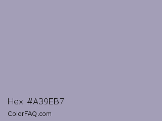 Hex #a39eb7 Color is a light indigo color and the nearest color is Santas Gray #9fa0b1. Hex code #a39eb7 and RGB value is rgb(163,158,183). In RGB color space, this color is composed of 64% red, 62% green, 72% blue, In CMYK color space, this color is composed of 11% cyan, 14% magenta, 0% yellow , 28% black , In HSL color space, this color has a hue angle of 252° , 15% saturation and 67% lightness.