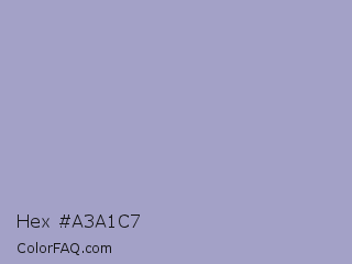 Hex #a3a1c7 Color is a light indigo color and the nearest color is Blue Bell #a2a2d0. Hex code #a3a1c7 and RGB value is rgb(163,161,199). In RGB color space, this color is composed of 64% red, 63% green, 78% blue, In CMYK color space, this color is composed of 18% cyan, 19% magenta, 0% yellow , 22% black , In HSL color space, this color has a hue angle of 243° , 25% saturation and 71% lightness.
