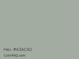Hex #a3aca0 Color is a light green color and the nearest color is Bud #a8ae9c. Hex code #a3aca0 and RGB value is rgb(163,172,160). In RGB color space, this color is composed of 64% red, 67% green, 63% blue, In CMYK color space, this color is composed of 5% cyan, 0% magenta, 7% yellow , 33% black , In HSL color space, this color has a hue angle of 105° , 7% saturation and 65% lightness.