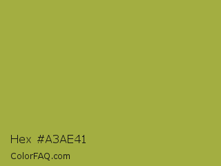 Hex #a3ae41 Color is a normal yellow color and the nearest color is Brass #b5a642. Hex code #a3ae41 and RGB value is rgb(163,174,65). In RGB color space, this color is composed of 64% red, 68% green, 25% blue, In CMYK color space, this color is composed of 6% cyan, 0% magenta, 63% yellow , 32% black , In HSL color space, this color has a hue angle of 66° , 46% saturation and 47% lightness.