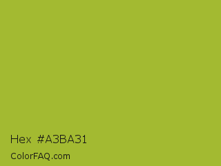 Hex #a3ba31 Color is a normal yellow color and the nearest color is Android Green #a4c639. Hex code #a3ba31 and RGB value is rgb(163,186,49). In RGB color space, this color is composed of 64% red, 73% green, 19% blue, In CMYK color space, this color is composed of 12% cyan, 0% magenta, 74% yellow , 27% black , In HSL color space, this color has a hue angle of 70° , 58% saturation and 46% lightness.