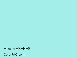 Hex #a3eee8 Color is a light cyan color and the nearest color is Water Leaf #a1e9de. Hex code #a3eee8 and RGB value is rgb(163,238,232). In RGB color space, this color is composed of 64% red, 93% green, 91% blue, In CMYK color space, this color is composed of 32% cyan, 0% magenta, 3% yellow , 7% black , In HSL color space, this color has a hue angle of 175° , 69% saturation and 79% lightness.