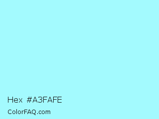 Hex #a3fafe Color is a very light cyan color and the nearest color is Waterspout #a4f4f9. Hex code #a3fafe and RGB value is rgb(163,250,254). In RGB color space, this color is composed of 64% red, 98% green, 100% blue, In CMYK color space, this color is composed of 36% cyan, 2% magenta, 0% yellow , 0% black , In HSL color space, this color has a hue angle of 183° , 98% saturation and 82% lightness.