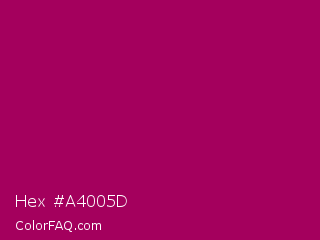 Hex #a4005d Color is a normal magenta color and the nearest color is Lipstick #ab0563. Hex code #a4005d and RGB value is rgb(164,0,93). In RGB color space, this color is composed of 64% red, 0% green, 36% blue, In CMYK color space, this color is composed of 0% cyan, 100% magenta, 43% yellow , 36% black , In HSL color space, this color has a hue angle of 326° , 100% saturation and 32% lightness.
