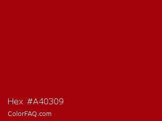 Hex #a40309 Color is a normal red color and the nearest color is Dark Candy Apple Red #a40000. Hex code #a40309 and RGB value is rgb(164,3,9). In RGB color space, this color is composed of 64% red, 1% green, 4% blue, In CMYK color space, this color is composed of 0% cyan, 98% magenta, 95% yellow , 36% black , In HSL color space, this color has a hue angle of 358° , 96% saturation and 33% lightness.
