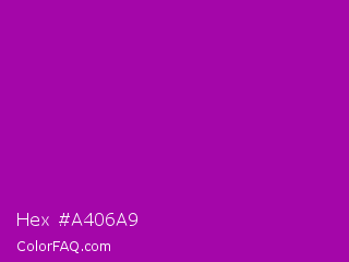 Hex #a406a9 Color is a normal magenta color and the nearest color is Heliotrope Magenta #aa00bb. Hex code #a406a9 and RGB value is rgb(164,6,169). In RGB color space, this color is composed of 64% red, 2% green, 66% blue, In CMYK color space, this color is composed of 3% cyan, 96% magenta, 0% yellow , 34% black , In HSL color space, this color has a hue angle of 298° , 93% saturation and 34% lightness.
