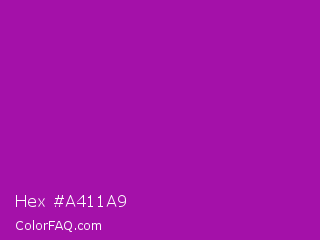 Hex #a411a9 Color is a normal magenta color and the nearest color is Violet Eggplant #991199. Hex code #a411a9 and RGB value is rgb(164,17,169). In RGB color space, this color is composed of 64% red, 7% green, 66% blue, In CMYK color space, this color is composed of 3% cyan, 90% magenta, 0% yellow , 34% black , In HSL color space, this color has a hue angle of 298° , 82% saturation and 36% lightness.