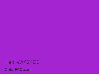 Hex #a424d2 Color is a normal purple color and the nearest color is Dark Orchid #9932cc. Hex code #a424d2 and RGB value is rgb(164,36,210). In RGB color space, this color is composed of 64% red, 14% green, 82% blue, In CMYK color space, this color is composed of 22% cyan, 83% magenta, 0% yellow , 18% black , In HSL color space, this color has a hue angle of 284° , 71% saturation and 48% lightness.