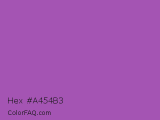 Hex #a454b3 Color is a normal purple color and the nearest color is Purple Plum #9c51b6. Hex code #a454b3 and RGB value is rgb(164,84,179). In RGB color space, this color is composed of 64% red, 33% green, 70% blue, In CMYK color space, this color is composed of 8% cyan, 53% magenta, 0% yellow , 30% black , In HSL color space, this color has a hue angle of 291° , 38% saturation and 52% lightness.