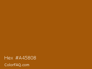 Hex #a45808 Color is a normal orange color and the nearest color is Rich Gold #a85307. Hex code #a45808 and RGB value is rgb(164,88,8). In RGB color space, this color is composed of 64% red, 35% green, 3% blue, In CMYK color space, this color is composed of 0% cyan, 46% magenta, 95% yellow , 36% black , In HSL color space, this color has a hue angle of 31° , 91% saturation and 34% lightness.