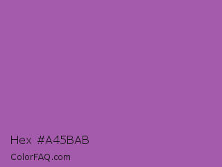 Hex #a45bab Color is a normal magenta color and the nearest color is Purpureus #9a4eae. Hex code #a45bab and RGB value is rgb(164,91,171). In RGB color space, this color is composed of 64% red, 36% green, 67% blue, In CMYK color space, this color is composed of 4% cyan, 47% magenta, 0% yellow , 33% black , In HSL color space, this color has a hue angle of 295° , 32% saturation and 51% lightness.