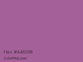 Hex #a46098 Color is a normal magenta color and the nearest color is Strikemaster #956387. Hex code #a46098 and RGB value is rgb(164,96,152). In RGB color space, this color is composed of 64% red, 38% green, 60% blue, In CMYK color space, this color is composed of 0% cyan, 41% magenta, 7% yellow , 36% black , In HSL color space, this color has a hue angle of 311° , 27% saturation and 51% lightness.