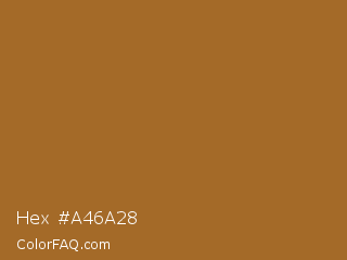 Hex #a46a28 Color is a normal orange color and the nearest color is Desert #ae6020. Hex code #a46a28 and RGB value is rgb(164,106,40). In RGB color space, this color is composed of 64% red, 42% green, 16% blue, In CMYK color space, this color is composed of 0% cyan, 35% magenta, 76% yellow , 36% black , In HSL color space, this color has a hue angle of 32° , 61% saturation and 40% lightness.