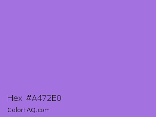 Hex #a472e0 Color is a light violet color and the nearest color is Dark Pastel Purple #966fd6. Hex code #a472e0 and RGB value is rgb(164,114,224). In RGB color space, this color is composed of 64% red, 45% green, 88% blue, In CMYK color space, this color is composed of 27% cyan, 49% magenta, 0% yellow , 12% black , In HSL color space, this color has a hue angle of 267° , 64% saturation and 66% lightness.