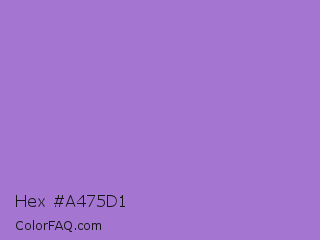 Hex #a475d1 Color is a light purple color and the nearest color is Rich Lavender #a76bcf. Hex code #a475d1 and RGB value is rgb(164,117,209). In RGB color space, this color is composed of 64% red, 46% green, 82% blue, In CMYK color space, this color is composed of 22% cyan, 44% magenta, 0% yellow , 18% black , In HSL color space, this color has a hue angle of 271° , 50% saturation and 64% lightness.