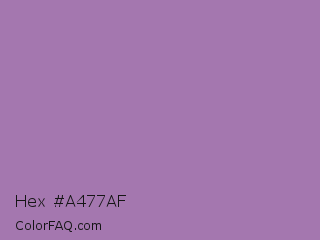 Hex #a477af Color is a normal purple color and the nearest color is Wisteria #9771b5. Hex code #a477af and RGB value is rgb(164,119,175). In RGB color space, this color is composed of 64% red, 47% green, 69% blue, In CMYK color space, this color is composed of 6% cyan, 32% magenta, 0% yellow , 31% black , In HSL color space, this color has a hue angle of 288° , 26% saturation and 58% lightness.