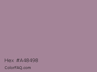 Hex #a48498 Color is a normal magenta color and the nearest color is Bouquet #ae809e. Hex code #a48498 and RGB value is rgb(164,132,152). In RGB color space, this color is composed of 64% red, 52% green, 60% blue, In CMYK color space, this color is composed of 0% cyan, 20% magenta, 7% yellow , 36% black , In HSL color space, this color has a hue angle of 323° , 15% saturation and 58% lightness.