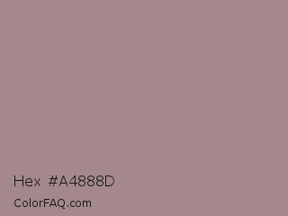 Hex #a4888d Color is a normal red color and the nearest color is Mountbatten Pink #997a8d. Hex code #a4888d and RGB value is rgb(164,136,141). In RGB color space, this color is composed of 64% red, 53% green, 55% blue, In CMYK color space, this color is composed of 0% cyan, 17% magenta, 14% yellow , 36% black , In HSL color space, this color has a hue angle of 349° , 13% saturation and 59% lightness.