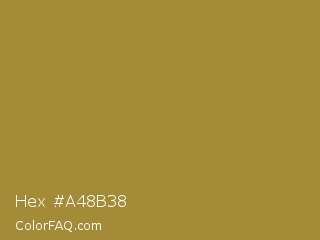 Hex #a48b38 Color is a normal yellow color and the nearest color is Luxor Gold #a7882c. Hex code #a48b38 and RGB value is rgb(164,139,56). In RGB color space, this color is composed of 64% red, 55% green, 22% blue, In CMYK color space, this color is composed of 0% cyan, 15% magenta, 66% yellow , 36% black , In HSL color space, this color has a hue angle of 46° , 49% saturation and 43% lightness.