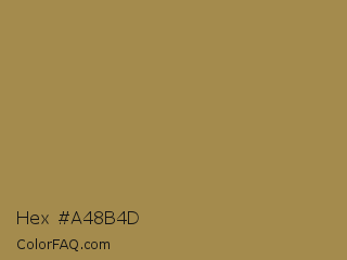 Hex #a48b4d Color is a normal orange color and the nearest color is Limed Oak #ac8a56. Hex code #a48b4d and RGB value is rgb(164,139,77). In RGB color space, this color is composed of 64% red, 55% green, 30% blue, In CMYK color space, this color is composed of 0% cyan, 15% magenta, 53% yellow , 36% black , In HSL color space, this color has a hue angle of 43° , 36% saturation and 47% lightness.