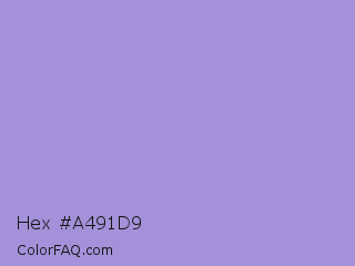 Hex #a491d9 Color is a light indigo color and the nearest color is East Side #ac91ce. Hex code #a491d9 and RGB value is rgb(164,145,217). In RGB color space, this color is composed of 64% red, 57% green, 85% blue, In CMYK color space, this color is composed of 24% cyan, 33% magenta, 0% yellow , 15% black , In HSL color space, this color has a hue angle of 256° , 49% saturation and 71% lightness.